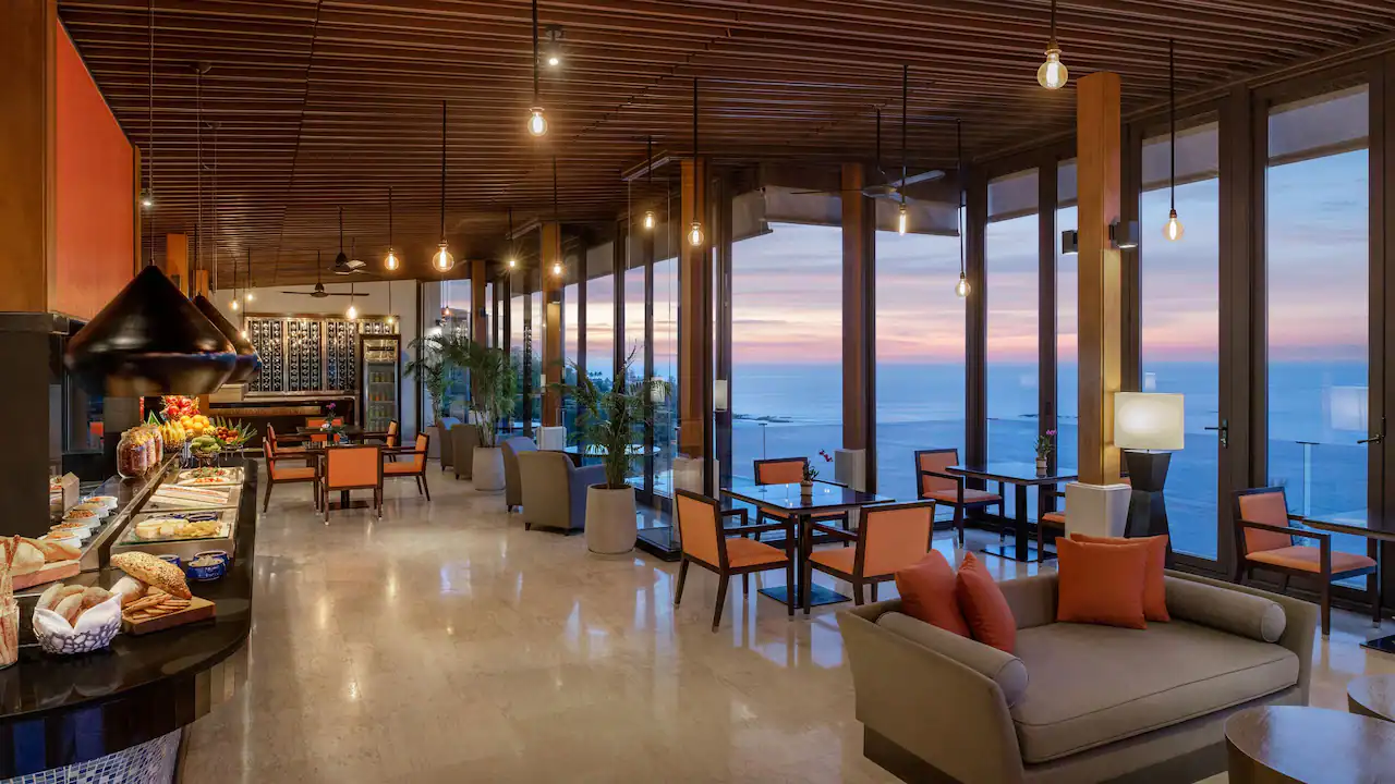 This is a very comfortable and spacious executive club lounge that enjoys the beauty of the wrap around floor to ceiling windows, offering a seamless indoor and outdoor flow. The wooden ceiling, along with the floor lamps dotted about, provides a tranquil setting in the evenings, the perfect place to feel cool, calm, and relaxed. Overall, this beautiful executive club lounge offers an added touch of luxury to your stay with complimentary food and beverage presentations you can take advantage of throughout the day.