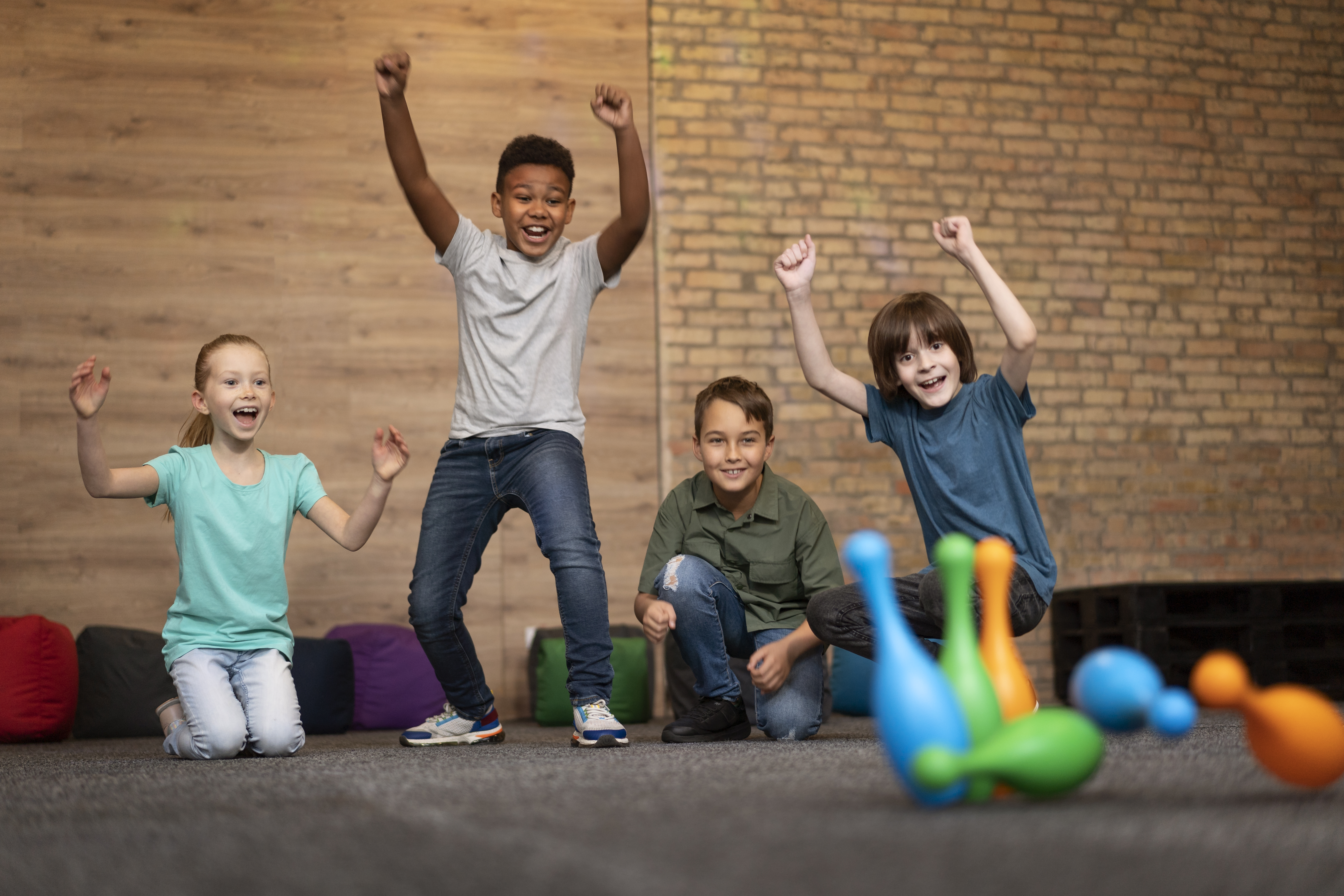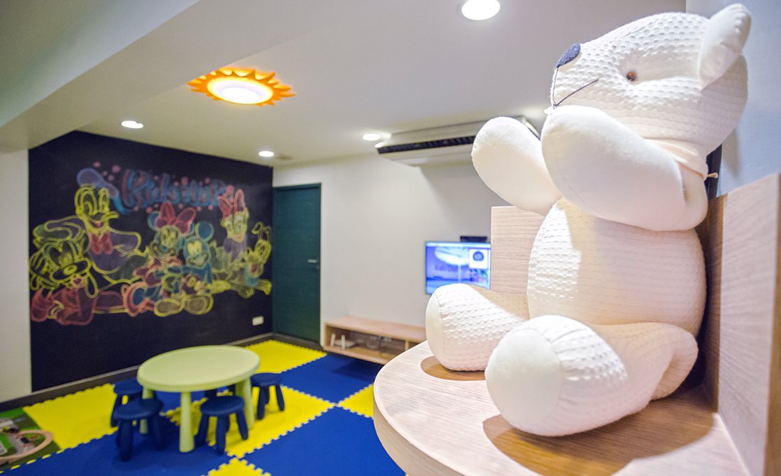It is a bright and light space with blue and yellow chequered matting on the floors and pale blue ceilings with sun-shaped ceiling lights. The white walls help to brighten the space, while the plastic tree playhouse grabs your attention from the one corner. There is a flat screen television on the wall, used to play age-appropriate films, while the giant teddy bear sits on a stage, ready to be cuddled while the film plays. There are also plush blue bean bags, which can be used when playing Xbox, or when watching a film. The shelves are overflowing with age-appropriate toys, games, and books for children to use and enjoy during their time in this engaging kids club.