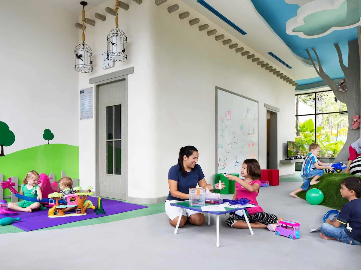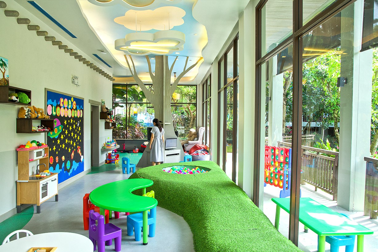 This spacious kids club includes and indoor and outdoor space. Indoors enjoys floor to ceiling windows that wrap around the kids club, allowing for plenty of natural light. The central tree is home to televisions, while there are clouds painted on the ceiling. The shelves are overflowing with toys and games, there is a ball pool, mini toy kitchen for creative play, and a fooseball table. There is children's colourful tables and chairs used for playing board games, reading, and arts and crafts. Heading outdoors, you find a mini playground with small climbing frame with slides, surrounded by lush trees and greenery. There is also an outdoor sand pit and mini table tennis.