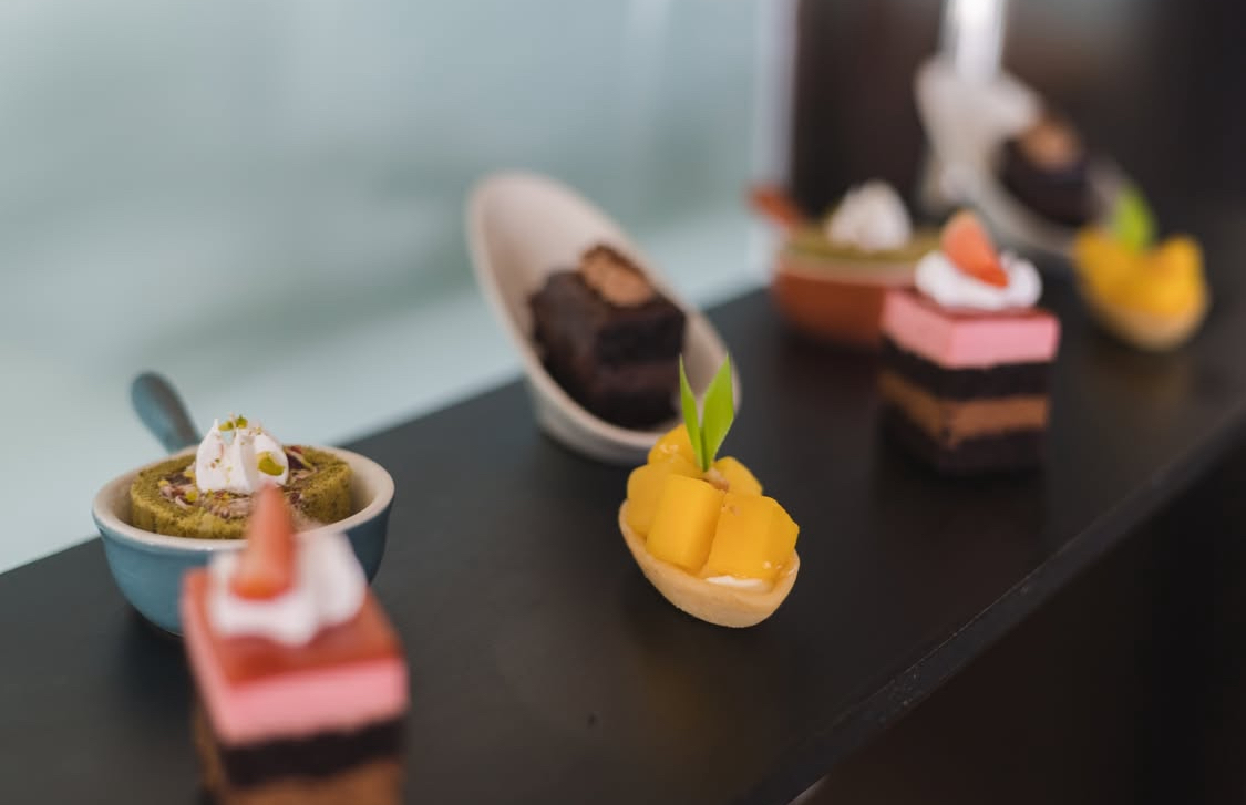 To the one side are large dark wood counters and a central food island, which are regularly stocked up throughout the day, ensuring you can help yourself buffet-style at any time. The design makes food presentations enjoyable with a seamless flow, even during busy periods. The breakfast and evening canapés are a delight with hot and cold options, all freshly prepared by the skilled team of resort chefs, using local ingredients.
