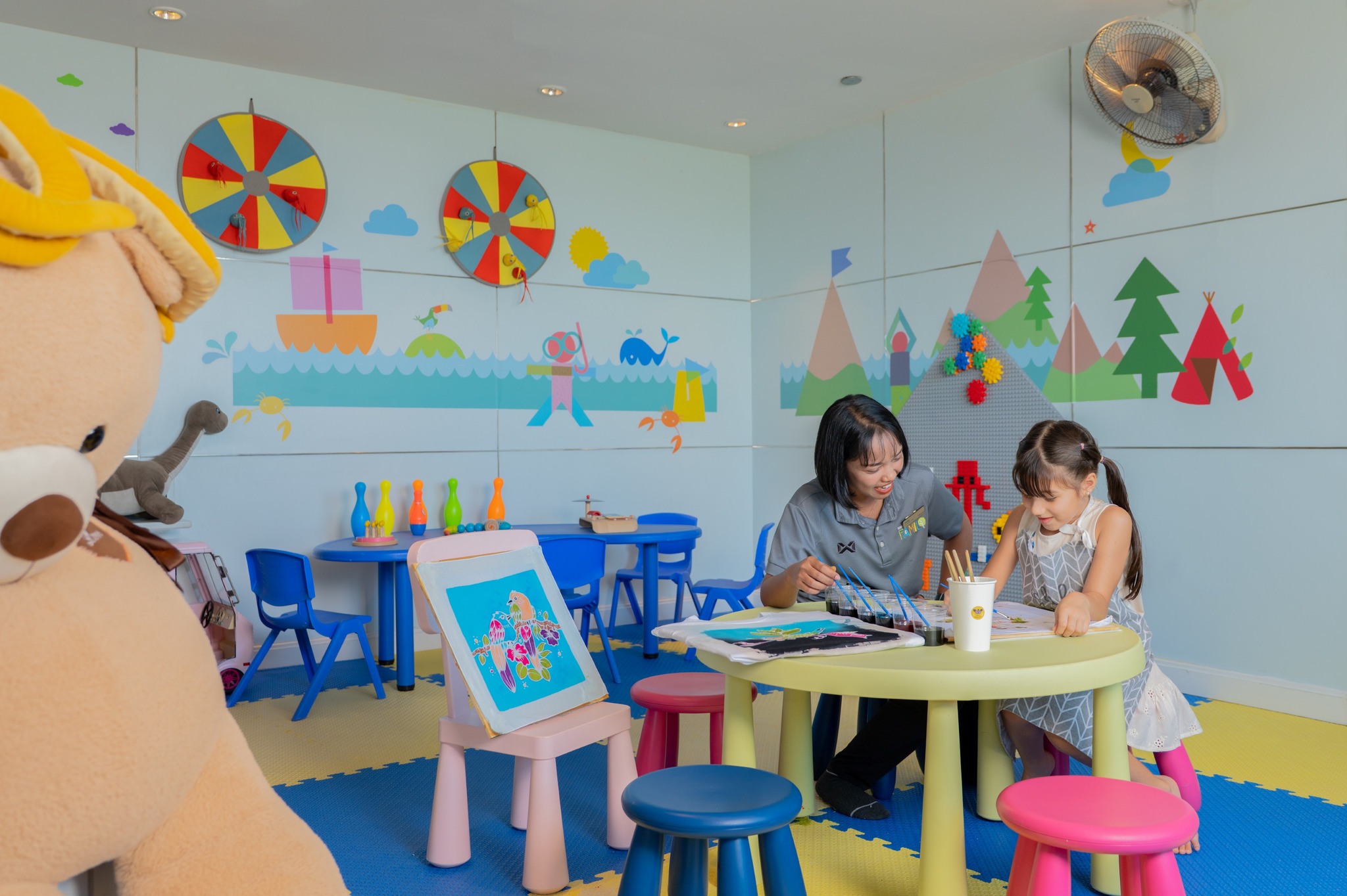The kids club at The Westin Siray Bay Resort & Spa Phuket is fully supervised by a team of experienced childminders. They offer complimentary access to young guests staying at the resort, offering mostly free play time with some scheduled activities provided throughout the day. The kids club has been decorated with a beach theme, offering an air conditioned indoor area with an arts and crafts area and large plush teddy bears dotted about. The walls are light blue with beach drawings, while the kids tables and stools are placed on soft matting, ideal for board games or arts and crafts.